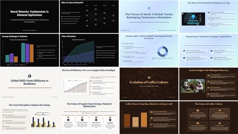 Skutečná hodnota je ve výstupech, které vypadají profesionálně a jsou rovnou použitelné. Většina AI agentů dnes vytváří prezentace tak, že jen vygeneruje „surový“ kód – výsledkem bývá nevyrovnané rozvržení, přeplácané vizuály a následně několik kol ručních oprav.