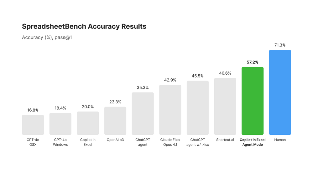 Agent Mode Microsoft vyhodnotil na kompletní sadě 912 instrukcí z SpreadsheetBench a dosáhl přesnosti 57,2 %. V testovacím prostředí Agent Mode provádí přímé úpravy workbooku přes Excel APIs v JavaScript runtime. Přesnost se měří pomocí skriptu od autorů SpreadsheetBench, který hodnotí výstup s využitím open-source knihovny openpyxl. Pro vyhodnocení u Claude a Shortcut.aI Microsoft úlohy SpreadsheetBench spouštěl ručně (včetně informací o umístění odpovědi potřebných pro spolehlivé hodnocení) a stáhl vytvořené Excel soubory. Tyto stažené soubory pak byly ohodnoceny stejným hodnoticím skriptem od autorů SpreadsheetBench. U vyhodnocení s Claude se podařilo dokončit 895 z 912 instrukcí. Čísla přesnosti byla spočítána pouze z dokončených úloh. Všechny benchmarkové výsledky OpenAI byly původně publikovány OpenAI zde.Microsoft Agent Mode měří jak na interních evaluačních sadách, tak na veřejném benchmarku SpreadsheetBench. Výsledky na SpreadsheetBench řadí Agent Mode na špičku současných systémů – správně dokončí 57,2 % úloh v benchmarku.