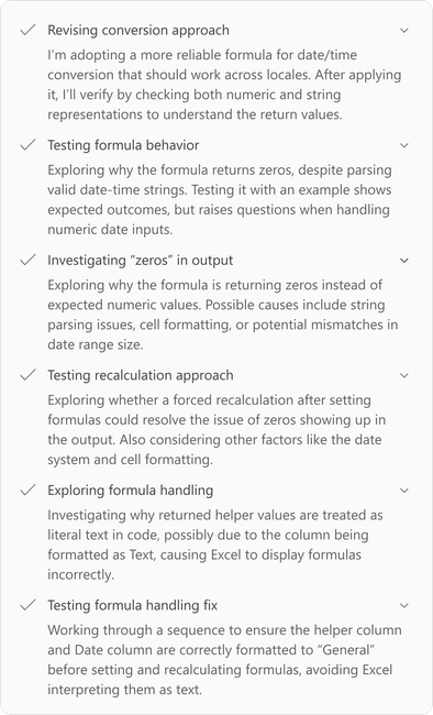 Proto Agent Mode v Excelu pojímá každý tool call jako auditovatelný a ověřitelný workflow. Než se provede akce, reasoning engine nejdřív vygeneruje jednoduché testy, které stanoví očekávané výsledky. Tyto kontroly fungují jako ověřitelné „guardrails“ – každý krok lze zkontrolovat a znovu reprodukovat. Důležité je, že místo natvrdo zadaných hodnot Agent Mode provádí všechny výpočty přímo v gridu. Tím se zachová kompletní struktura závislostí v sešitu a uživatelé mohou auditovat mezivýsledky, sledovat vzorce a ověřovat správnost v každé fázi.