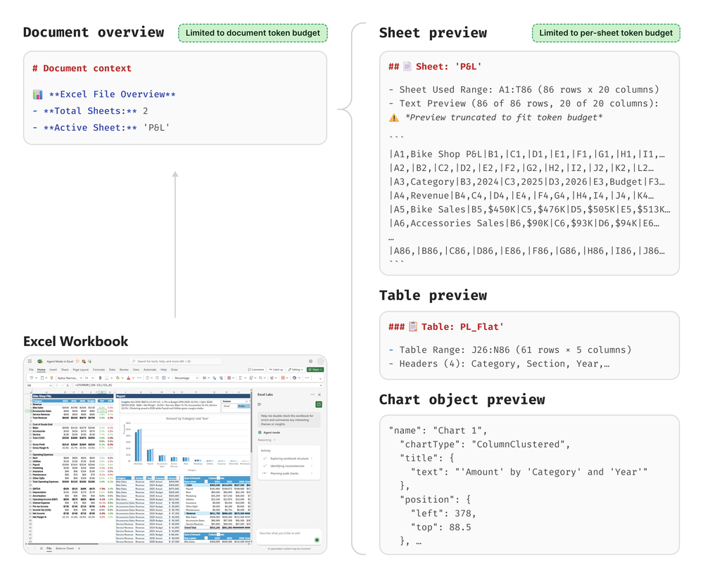 Aby takové selektivní prozkoumávání fungovalo, Microsoft vyvinul Document Context Producer, který běží v koordinovaném push-and-pull režimu. V části „push“ Document Context Producer proaktivně pošle spolu s promptem uživatele kompaktní „blueprint“ sešitu – souhrn rozložení, hodnot, objektů a grafu závislostí vzorců – přičemž složitější objekty kóduje do JSON a tabulková data do Markdown. Když je potřeba jít víc do hloubky, reasoning engine si pak může vyžádat a „pull“ způsobem dotáhnout další informace podle potřeby, takže má vždy k dispozici kontext, se kterým může efektivně pracovat.